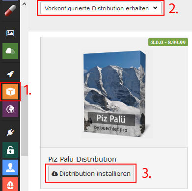 Gehen Sie dazu in die Verwaltungsoberfläche von TYPO3 und installieren Sie die Distribution "Piz Palü". Dazu kann im linken Panel das Modul "Erweiterungen" ausgewählt werden.